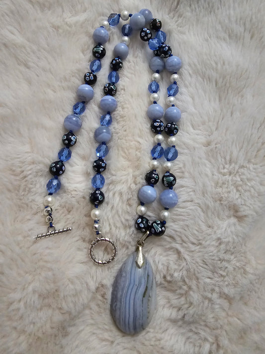 Beautiful hand knotted necklace of Blue lace agate; large vintage natural stone, small pearls, vintage AV blue glass crystal beads and vintage Chinese hand painted porcelain beads.