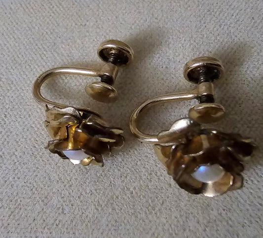Beautiful 1950's 12ct gold filled and cultured pearl rose earrings, breathtakingly beautiful.