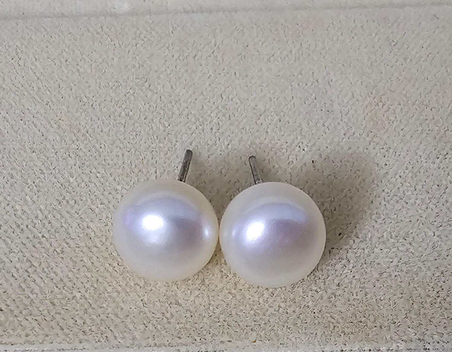 Pretty cultured pearl button stud earrings 9mm diameter with ivory gold tones