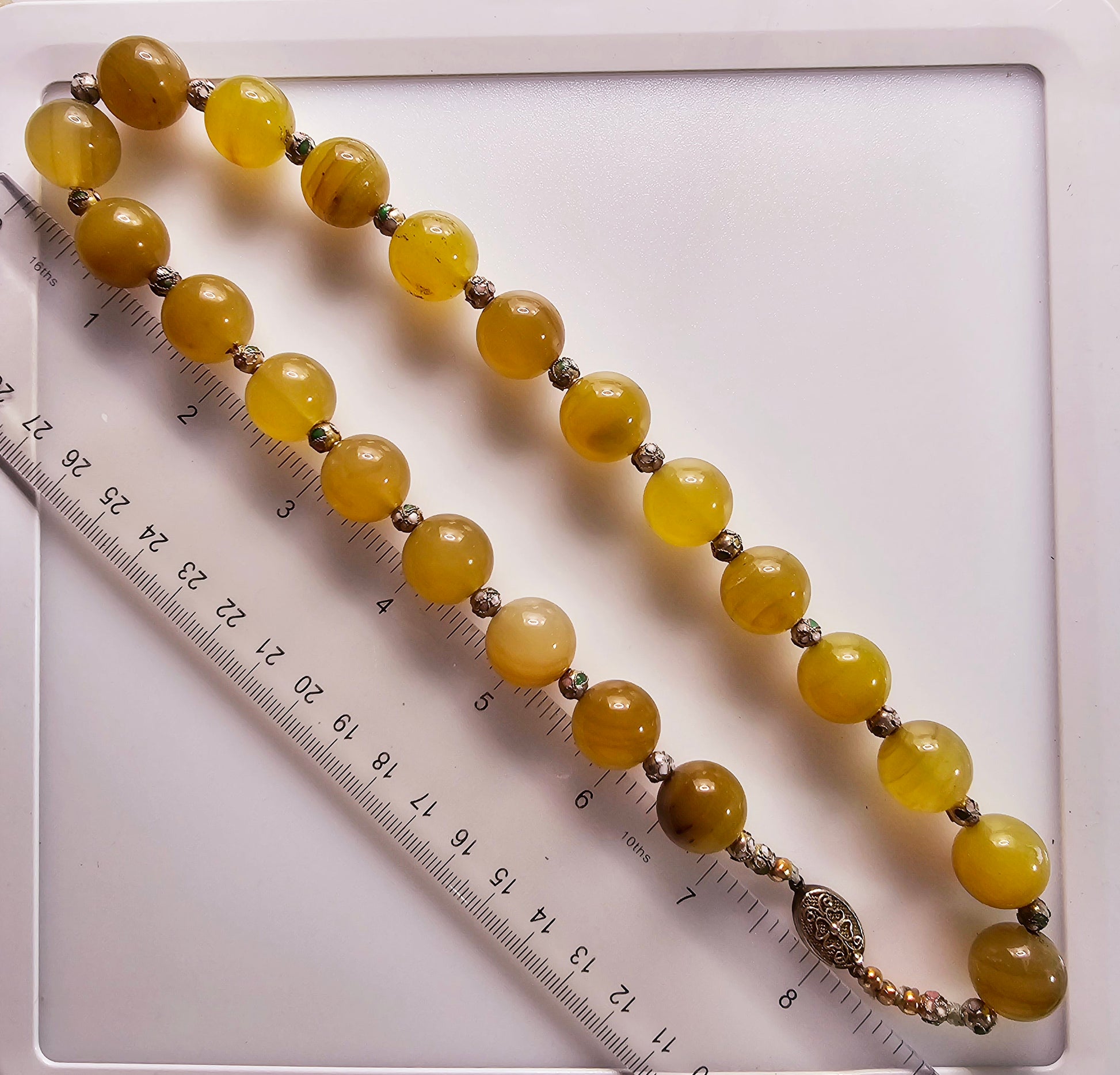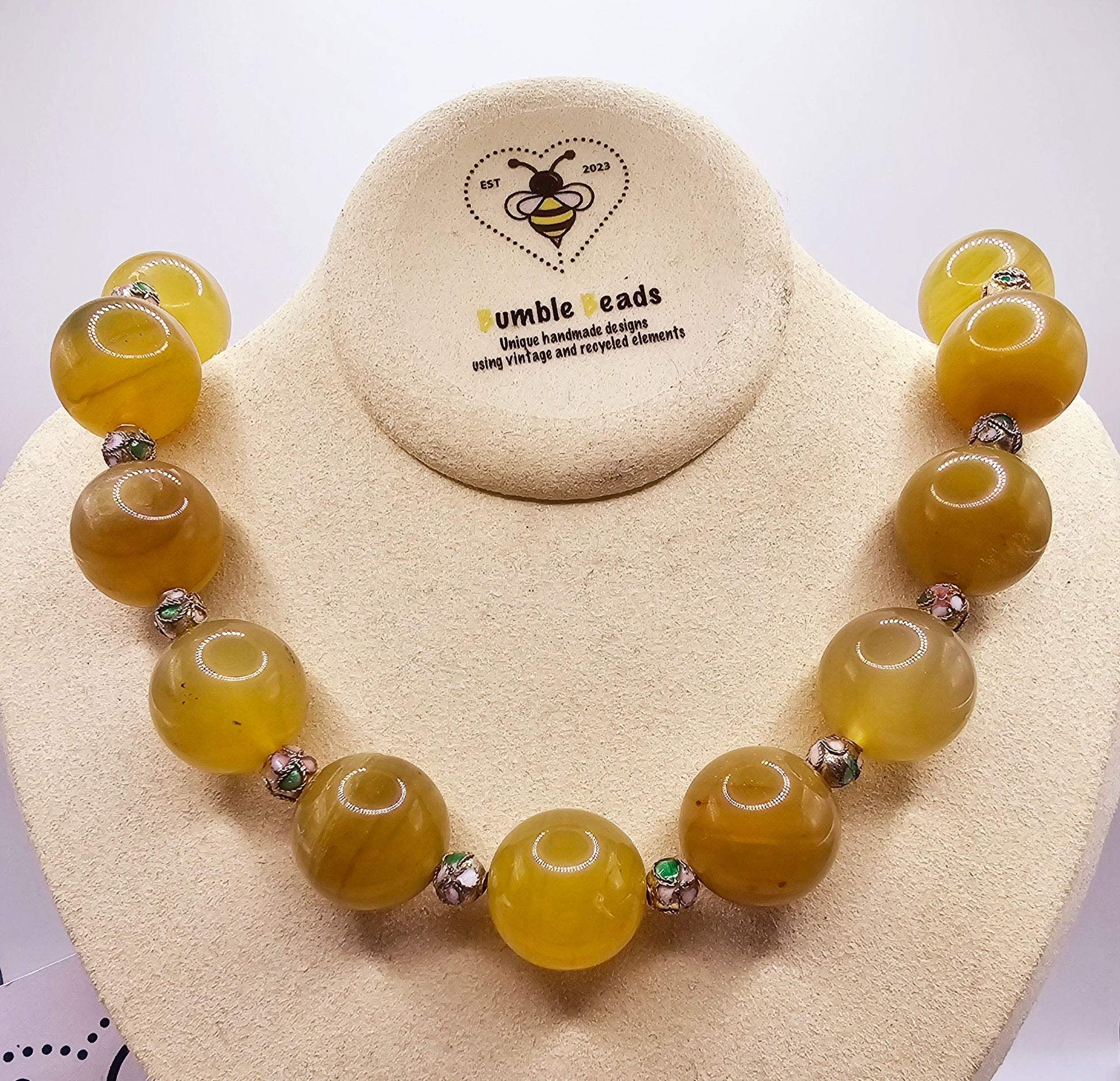 Yellow banded agate choker necklace with cloisonne spacer beads